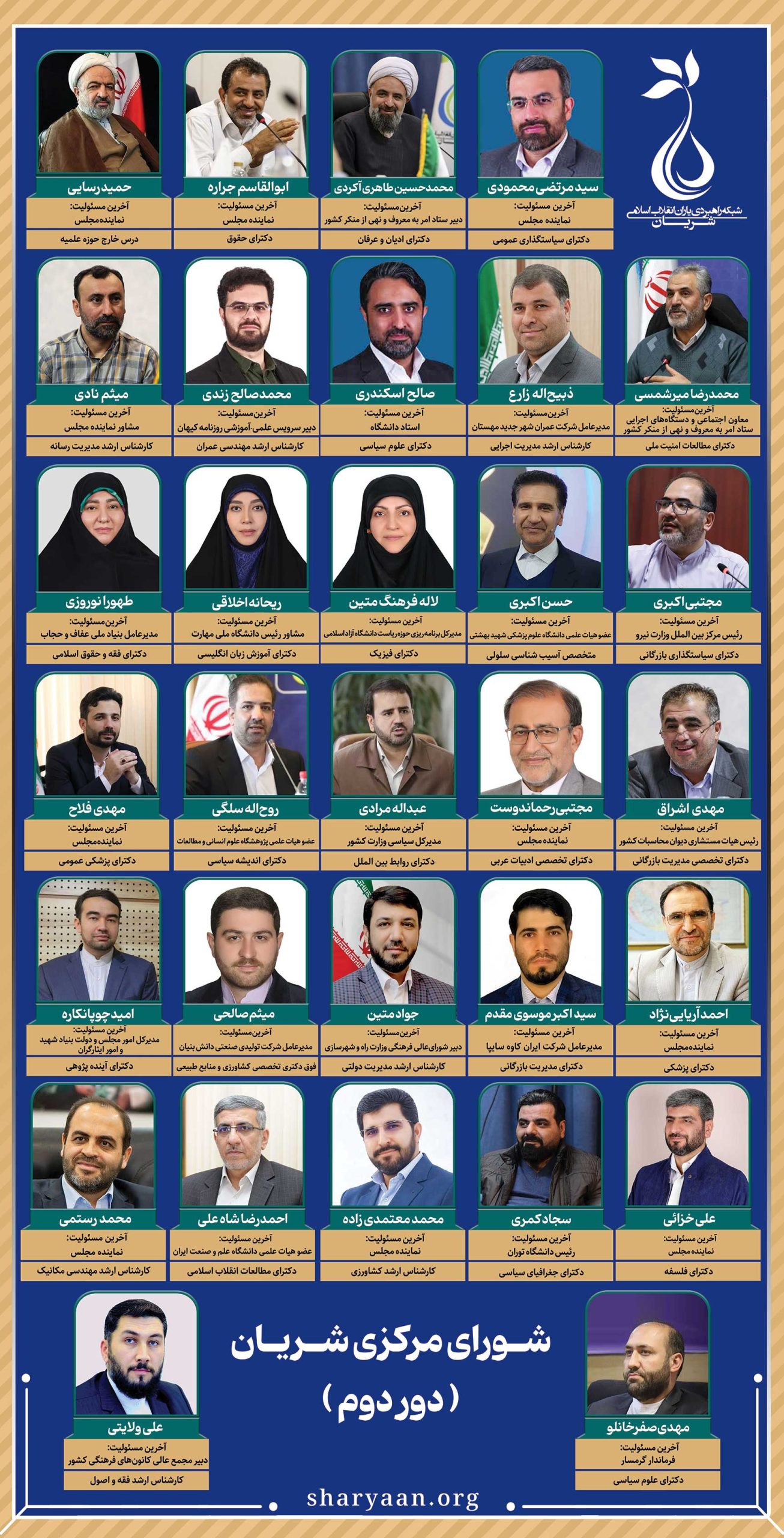 روز پنجشنبه ۶ دیماه ۱۴۰۳ و با رای حاضرین در دومین مجمع ملی شبکه راهبردی یاران انقلاب اسلامی، ۳۱ عضو شورای مرکزی دوره دوم شریان، اعضای علی البدل و بازرسین به شرح ذیل انتخاب شدند: