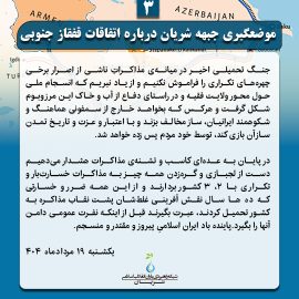 بسم الله الرحمن الرحیم وَمَن یَتَوَلَّ ٱللَّهَ وَرَسُولَهُۥ وَٱلَّذِینَ ءَامَنُواْ فَإِنَّ حِزۡبَ ٱللَّهِ هُمُ ٱلۡغَٰلِبُونَ در روزهایی که ملت منسجم و قهرمان ایران اسلامی متاثر از اربعین رهبر آزادگان جهان است، ترامپِ قاتل و جنایتکار در یک ماجراجویی تازه، درصدد برهم زدن صلح و ثبات در قفقاز جنوبی و حوالی مرز کشورمان برآمده است. جبهه […]